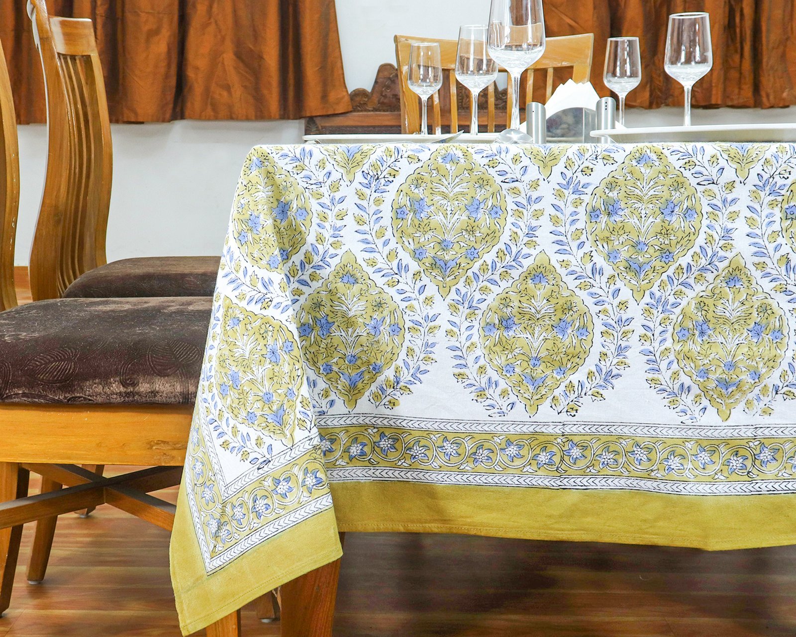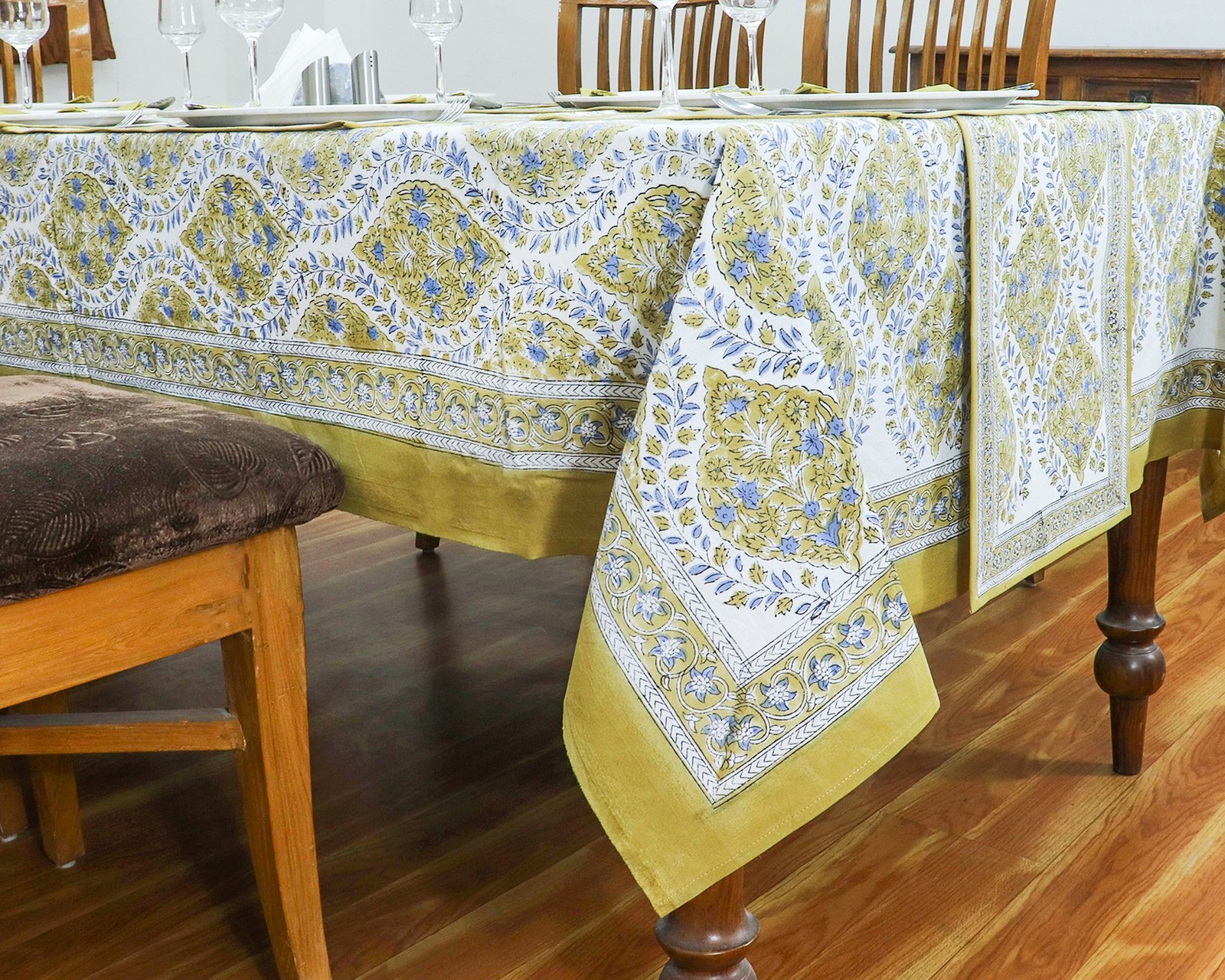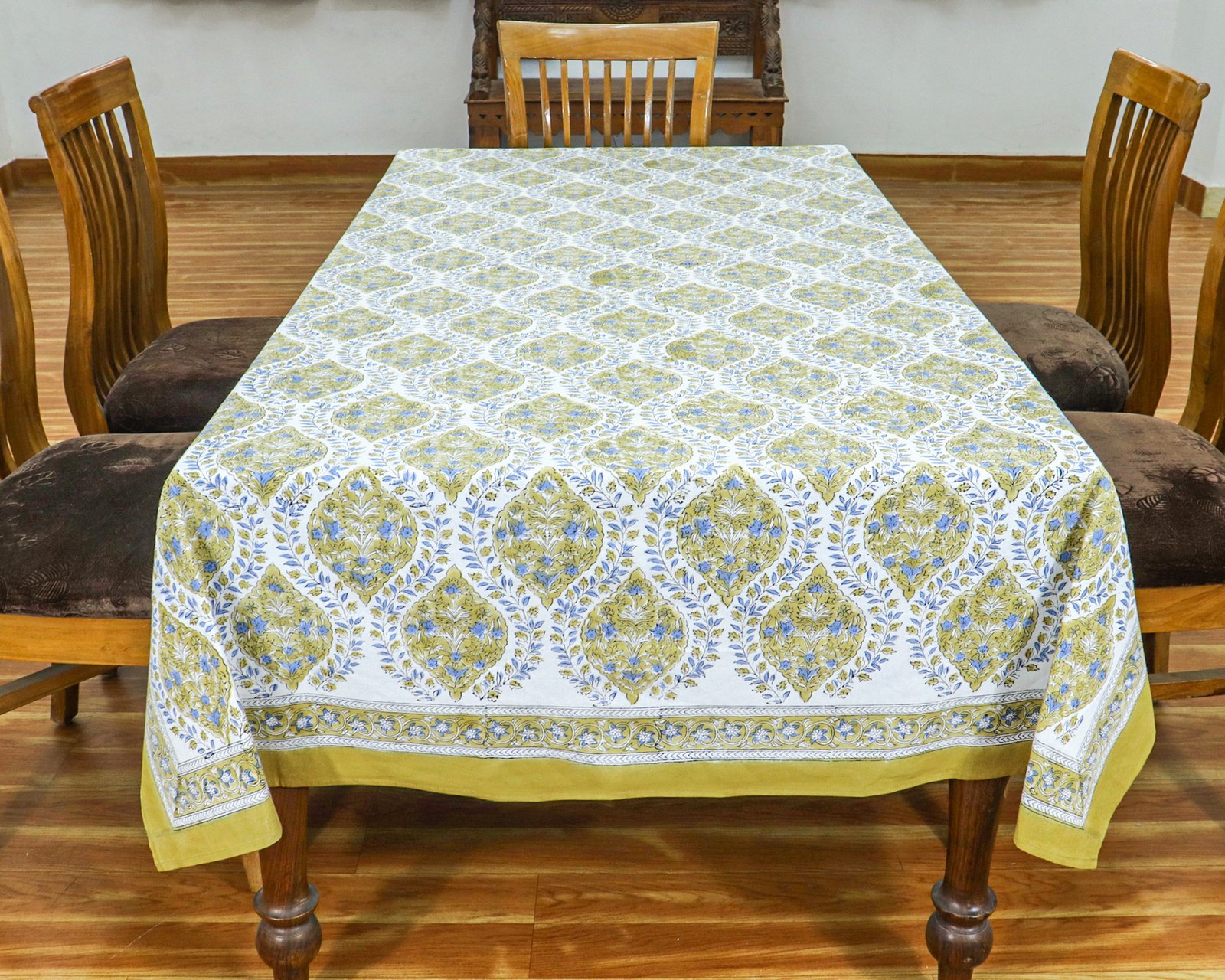 インド 木版染め(ブロックプリント) テーブルクロス ブルー 花柄 プレゼント アジアン インド更紗 インド綿 ハンドメイド エスニック インテリア コットン