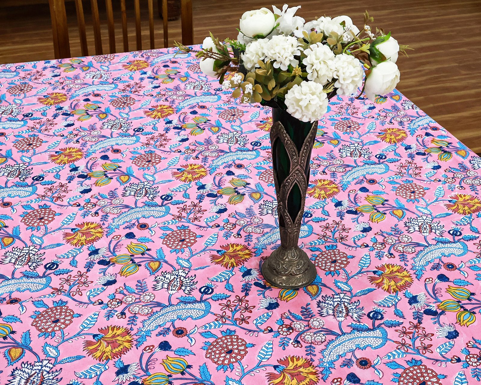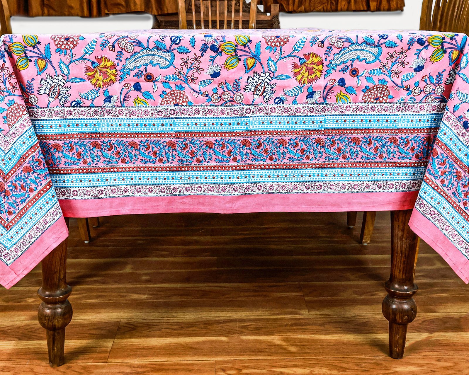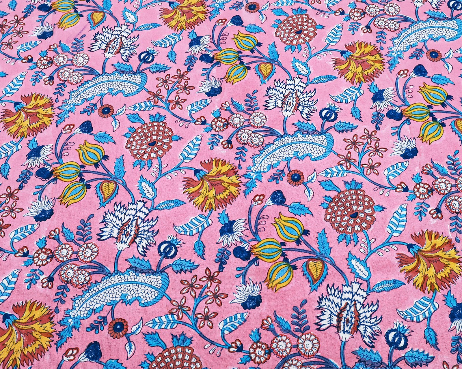 マルチクロス インド綿 ブロックプリントピンクとブルー おしゃれ かわいい 花柄 テーブルクロス ソファカバー シングルベッドカバー エシカル ハンドメイド インド雑貨 アジア雑貨 ボタニカル