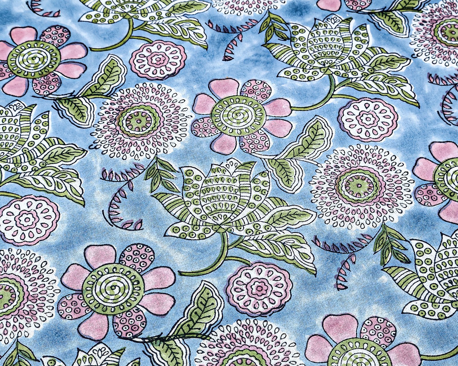 インドの職人がハンドメイドでひとつひとつお作りしたものです。そのため、柄や色の濃淡の差、また染ムラ、若干のシミやほつれなどが見られる場合がございます。こちらはハンドメイドの特徴としてご了承ください。