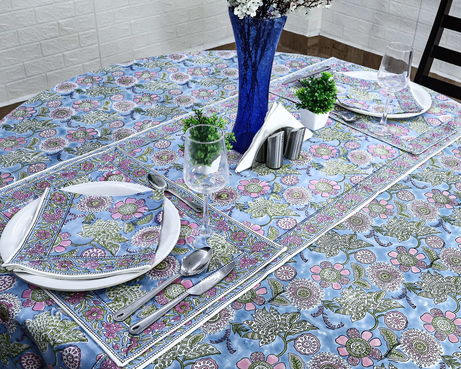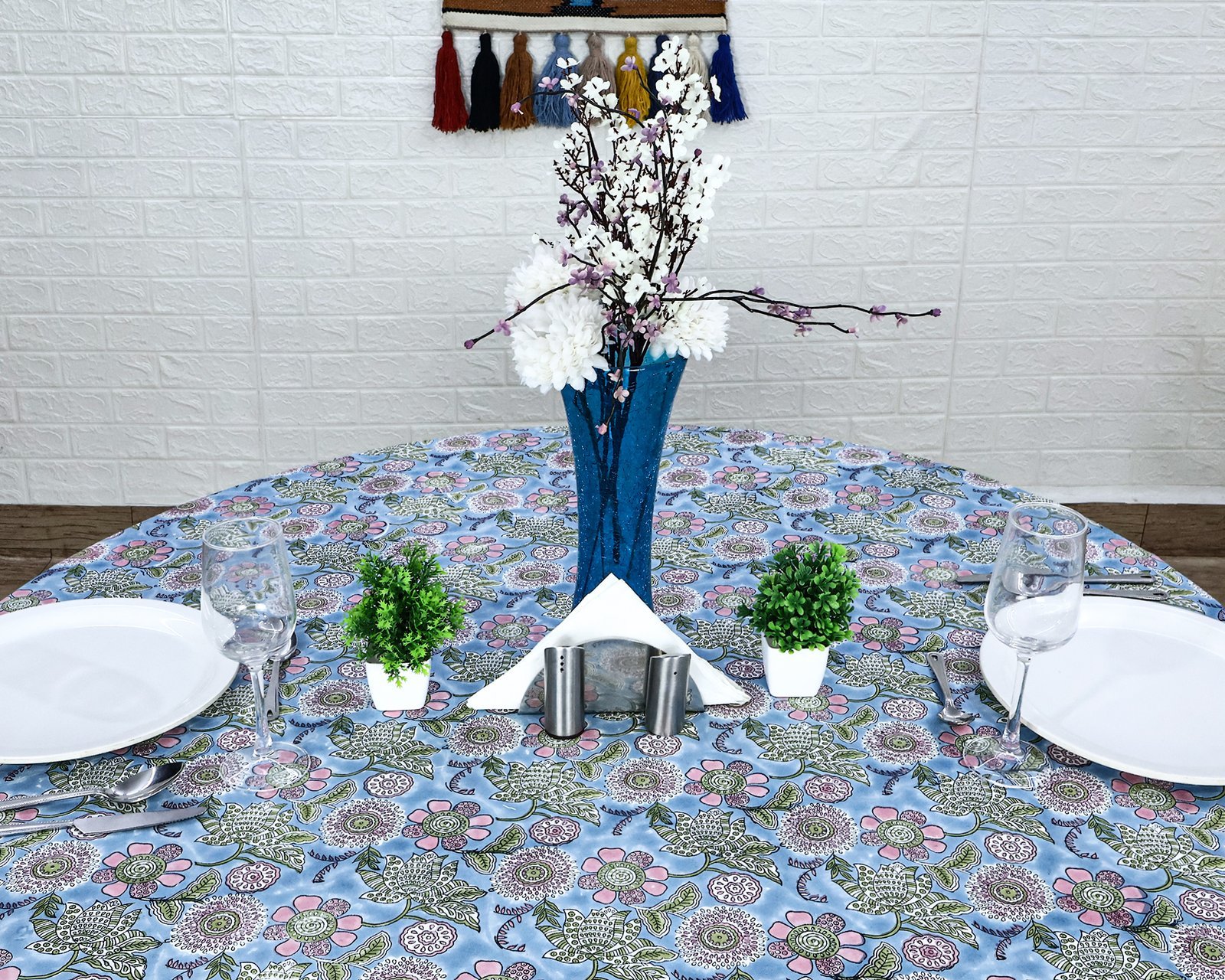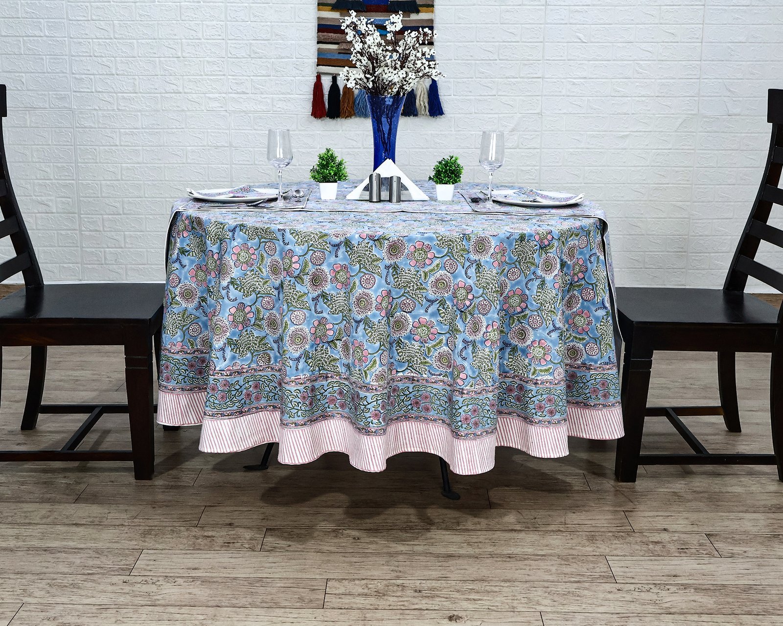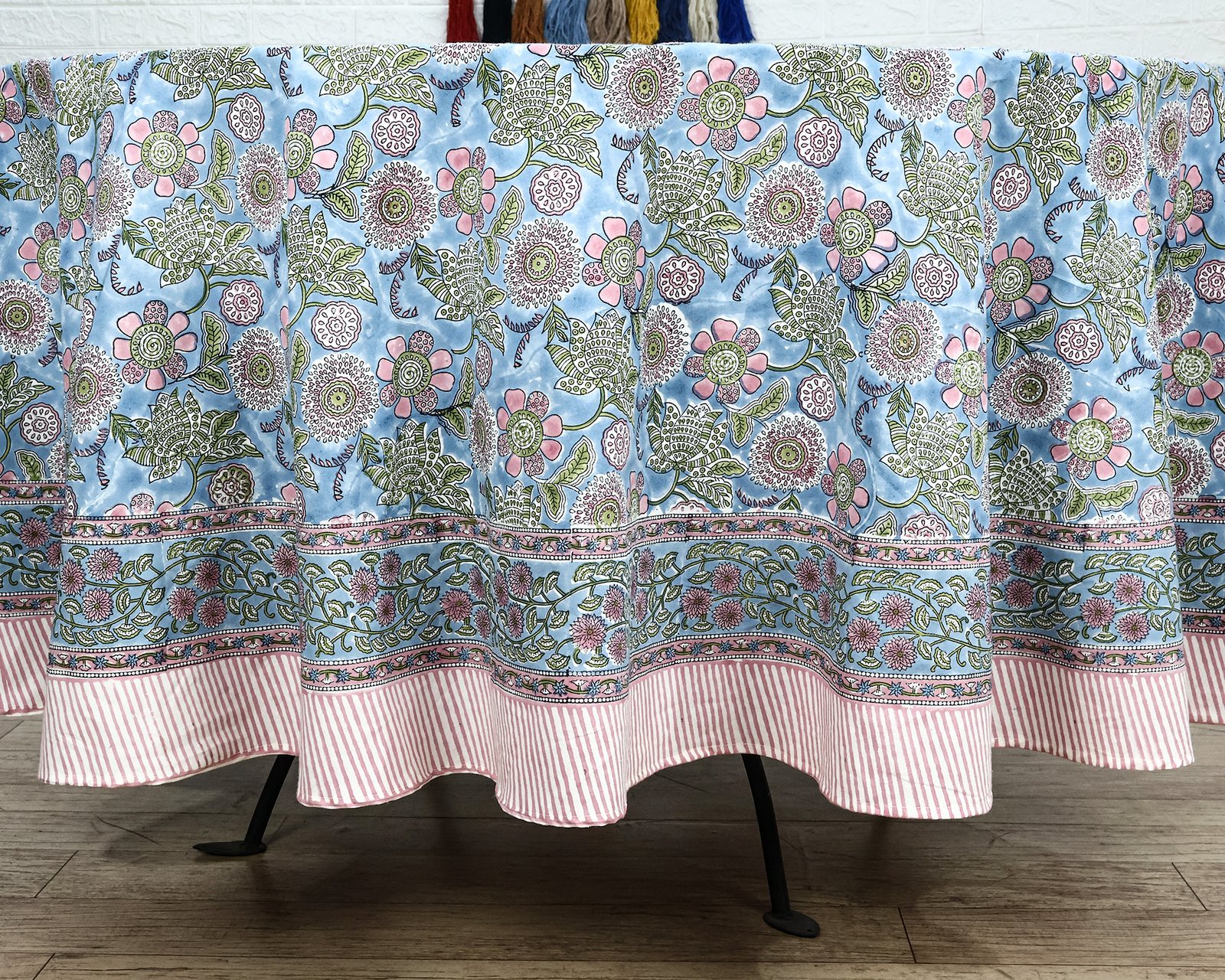 ラウンドクロス 円形クロス テーブルクロス インド綿 コットン エスニック ハンドメイド おしゃれ かわいい ブロックプリント ボタニカル柄 ブルー プリント
