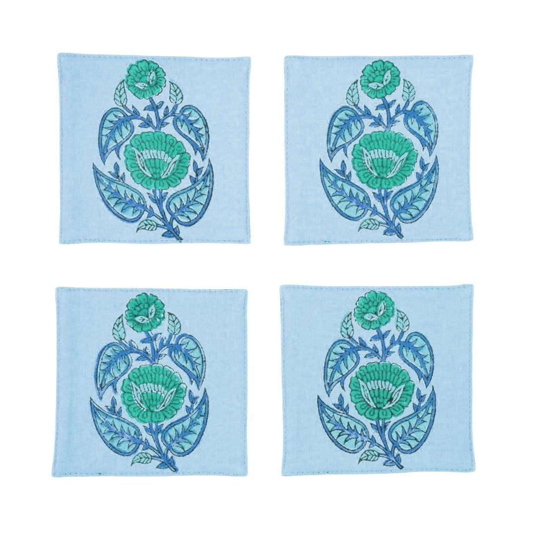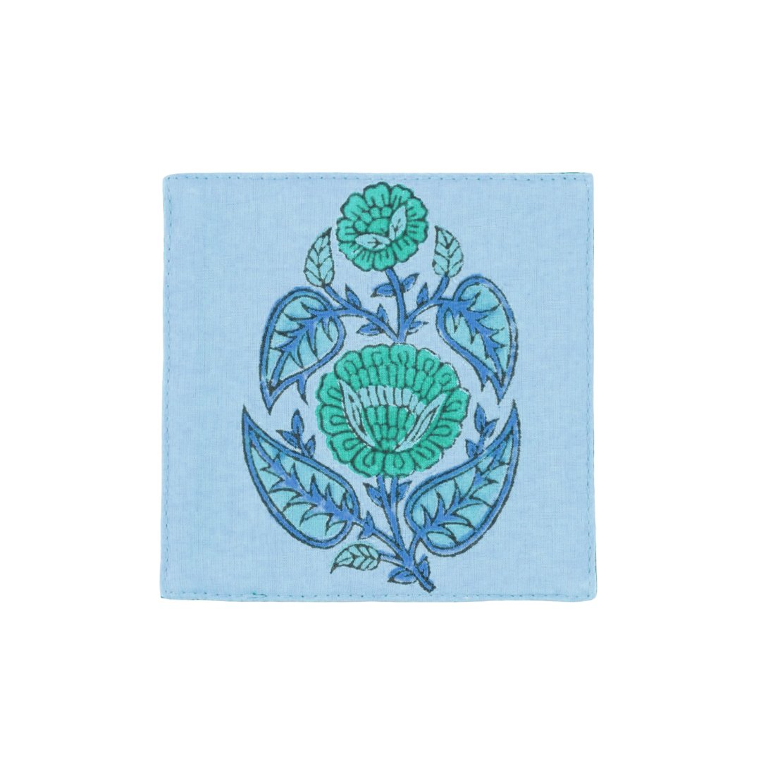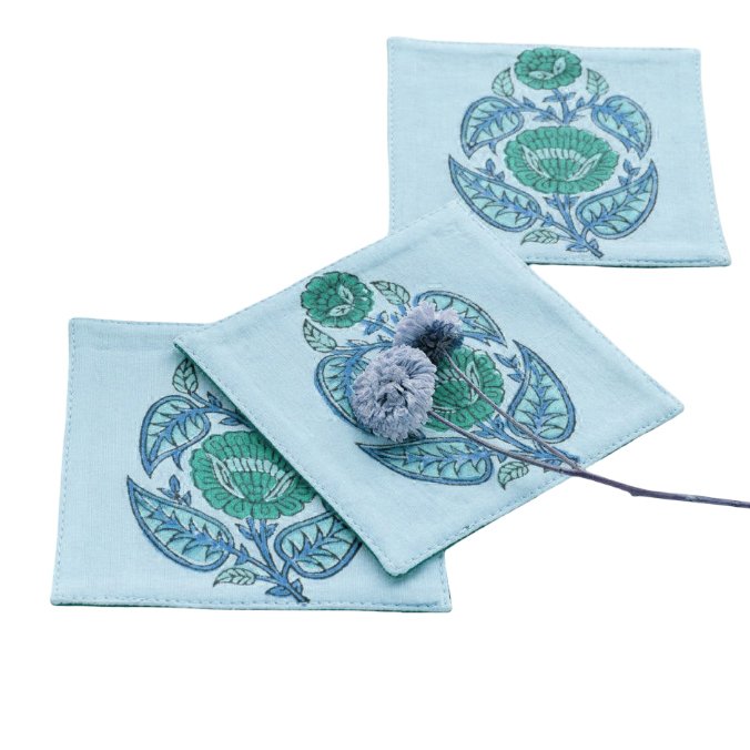 生地に木版(ブロック)を1つ1つ手で押していき絵柄をプリントするインドのブロックプリントのコースター。手作りのぬくもりを感じられるシリーズです。