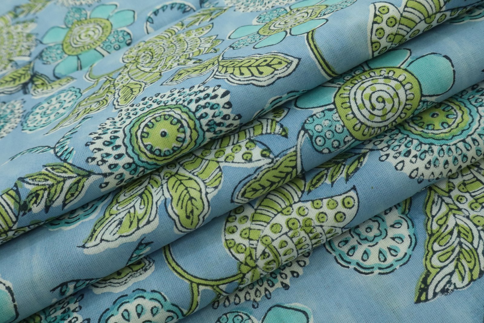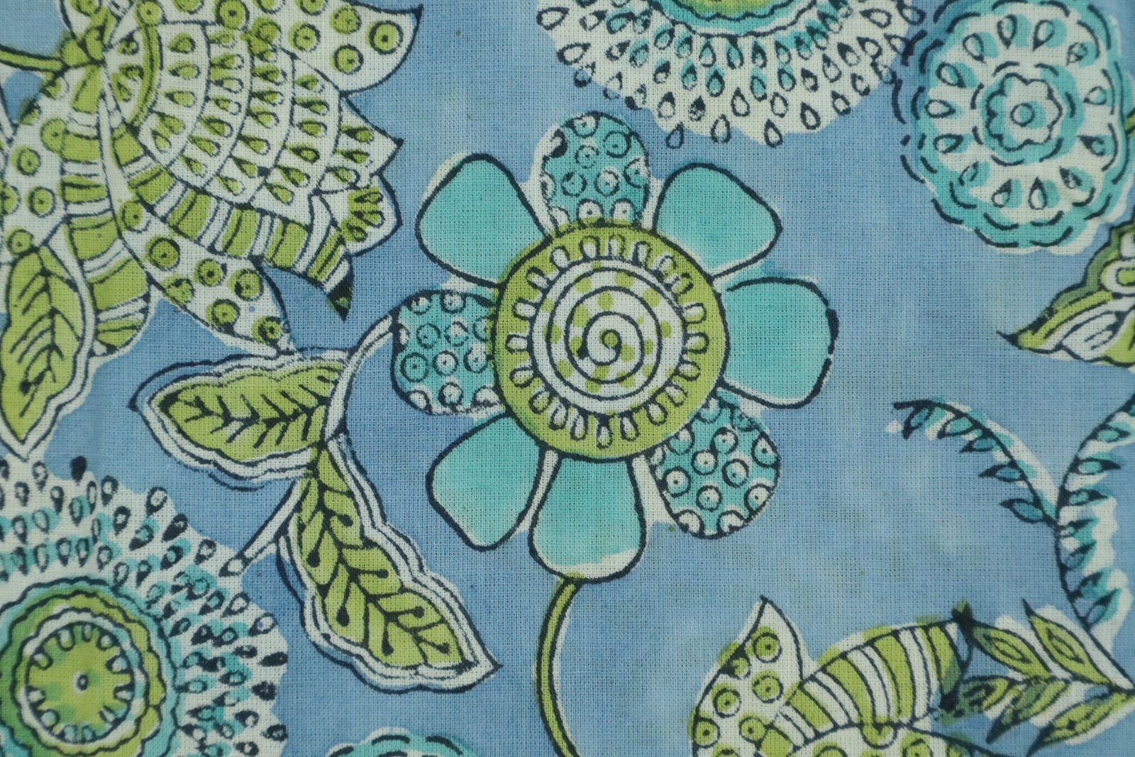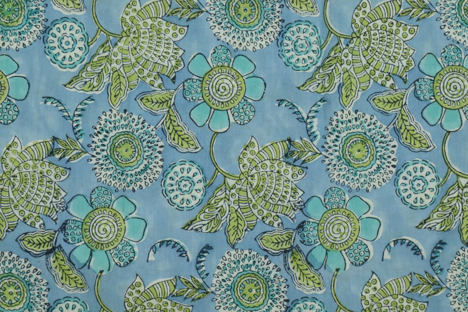 This fabric is made from 100% natural cotton and is entirely hand block printed using traditional techniques. The cotton base is a running fabric — pre-woven and ready for printing — chosen for its softness, breathability, and eco-friendly properties.