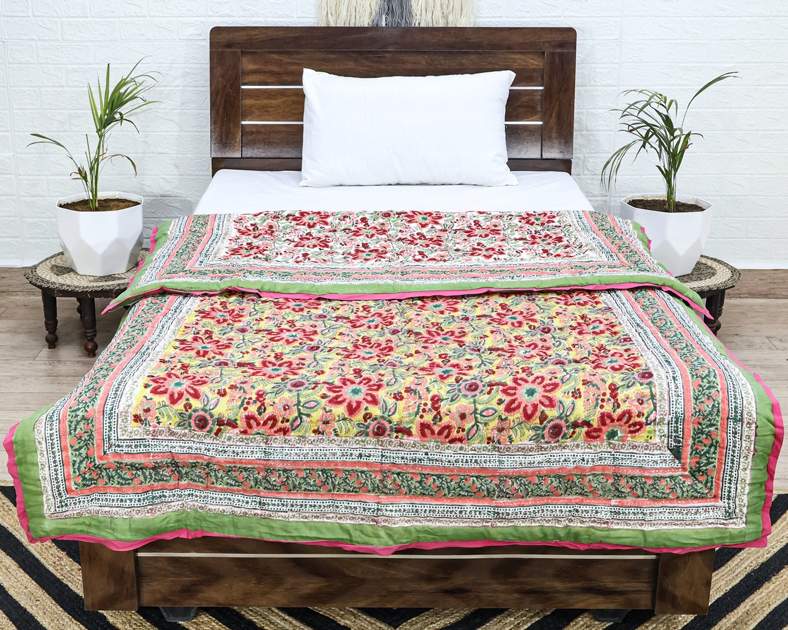 This beautiful Block Printed Cotton Quilt is meticulously handcrafted by skilled artisans in India, reflecting generations of textile tradition and artistry. Inspired by ethnic, royal, and nature-based motifs, the design blends classic elegance with cultural richness for a timeless appeal.